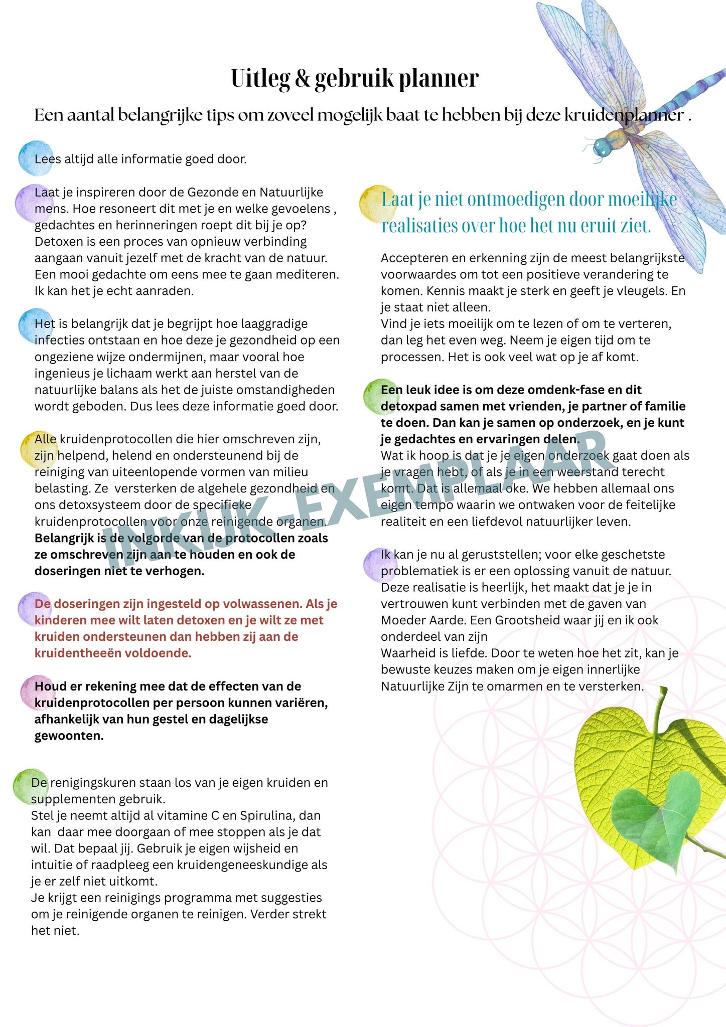 In deze jaarplanner vind je een plan van aanpak voor een verantwoorde detox én een plan van aanpak om je leefomgeving meer af te stemmen op jou als natuurlijk wezen, waardoor je weerstand verhoogt en gezondheid toeneemt. Dit alles gestoeld op de kennis van de natuurgeneeskunde en de kruidengeneeskunde.